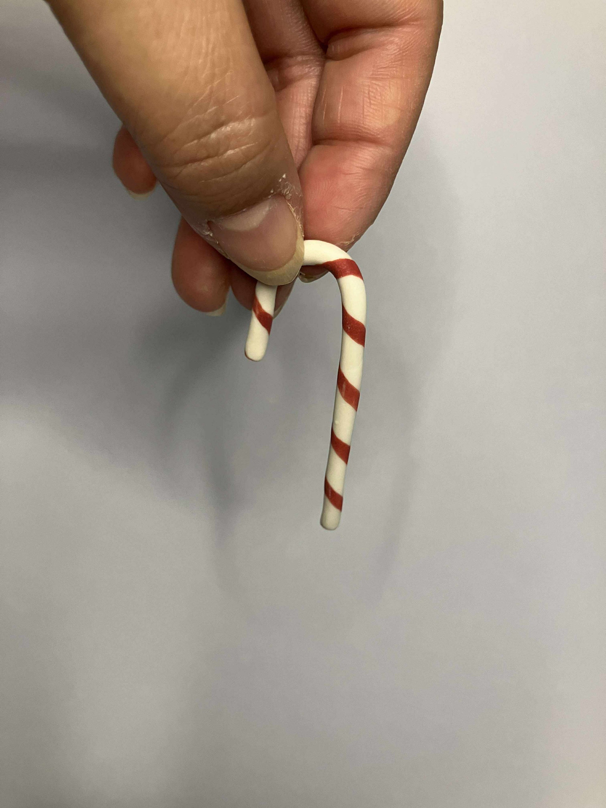 Små hvid/røde julestokke til ophæng, lavet af keramik.